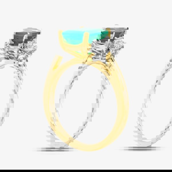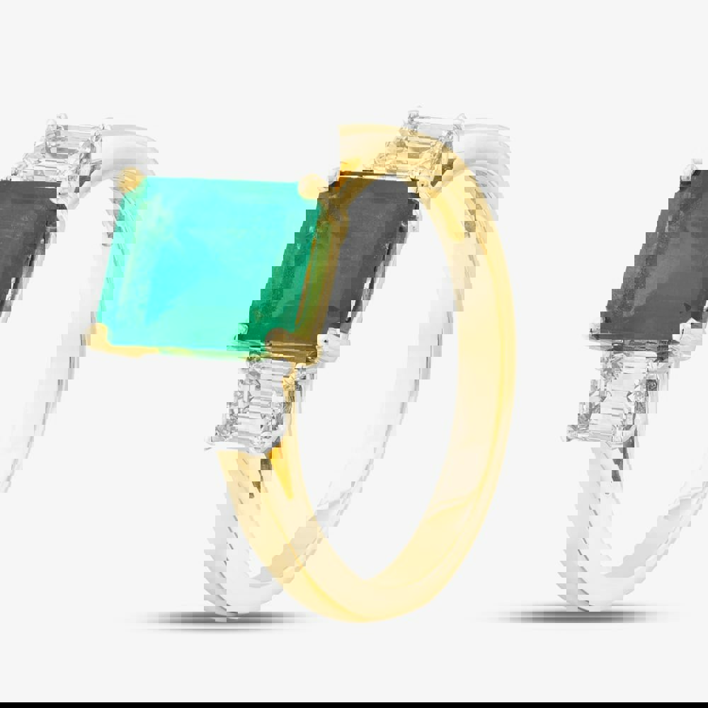 This elegant 18ct yellow gold three-stone ring showcases a captivating 1. 85ct emerald cut emerald at its centre. The lush green hue of the emerald is strikingly complemented by two 0. 77ct round brilliant-cut diamonds on either side, which add a radiant sparkle to the design. The rich tone of the yellow gold band enhances both the vibrant colour of the emerald and the brilliance of the diamonds, creating a timeless and luxurious piece. This ring combines classic beauty with a bold statement, perfect for those seeking an extraordinary and refined piece of jewellery.