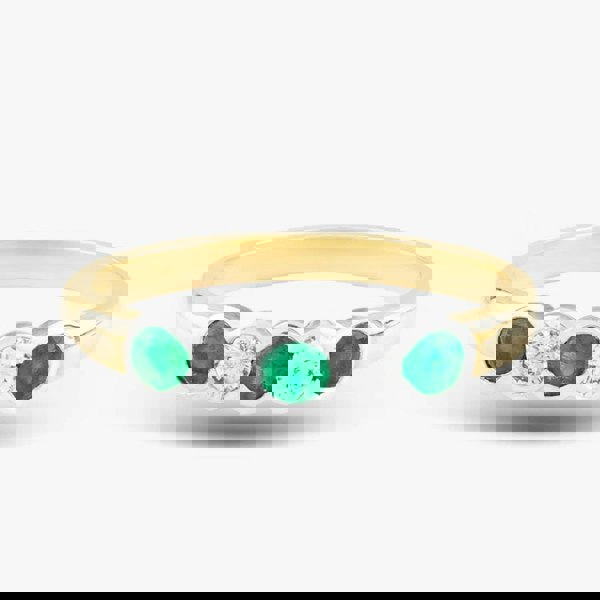 Crafted with a touch of simplicity, this five-stone ring exudes timeless elegance. Delicate 18ct yellow gold embraces brilliant-cut emerald and white diamonds in an alternating pattern, nestled securely in a rubover setting. The perfect accompaniment for any special occasion, this ring promises to leave a lasting impression.