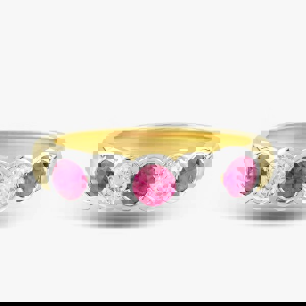 Crafted with a touch of simplicity, this five-stone ring exudes timeless elegance. Delicate 18ct yellow gold embraces brilliant-cut ruby and white diamonds in an alternating pattern, nestled securely in a rubover setting. The perfect accompaniment for any special occasion, this ring promises to leave a lasting impression.