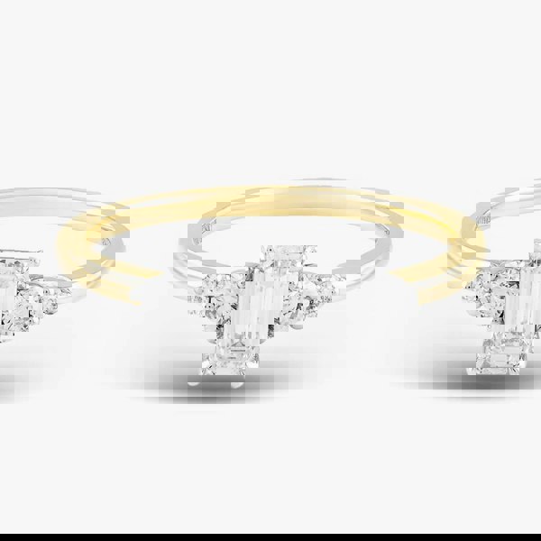 Crafted with a touch of simplicity, this shoulder-set ring exudes timeless elegance. The delicate 18ct yellow gold is adorned with an SI1 clarity, certified 0. 70ct emerald-cut white centre diamond with a graded colour of F, adorned with a brilliant-cut diamond on each shoulder, promising to sparkle with every movement, making this ring a timeless symbol of subtle luxury.