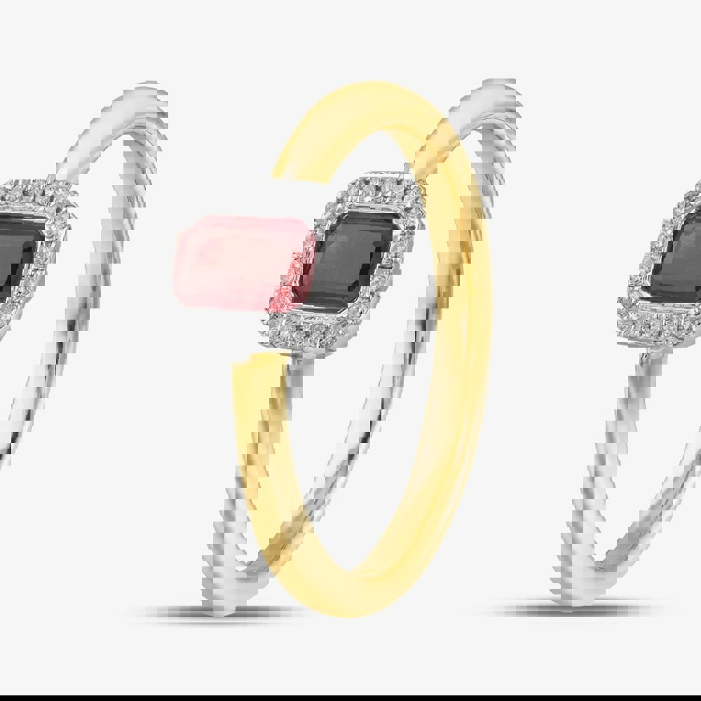 A stunning 18ct yellow gold ring featuring an exquisite emerald-cut ruby at its centre, elegantly framed by a halo of brilliant-cut diamonds. This timeless design beautifully combines vibrant colour with sparkling brilliance, making it a perfect statement piece for any occasion.