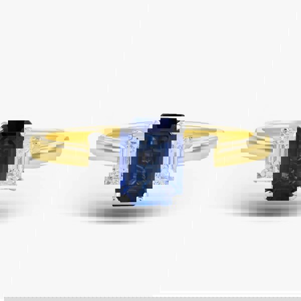 Crafted with a touch of simplicity, this three-stone ring exudes timeless elegance. The delicate 18ct yellow gold is adorned with an emerald-cut sapphire accentuated with a single emerald-cut white diamond set on each side, enhancing the centre stone. Each stone is set in a classic four-claw setting, and promises to sparkle with every movement, making this ring a timeless symbol of subtle luxury.