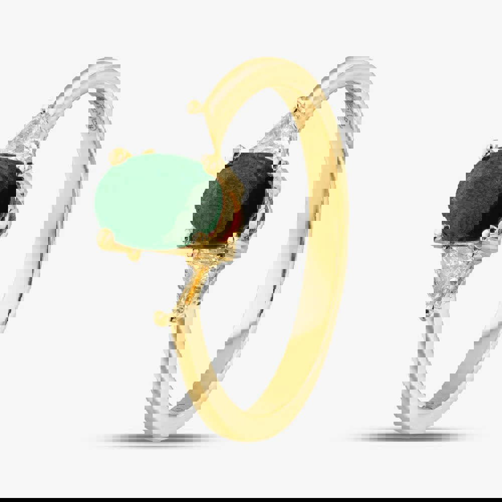 An exquisite 18ct yellow gold three-stone ring featuring a captivating oval-cut emerald at its centre in a four claw setting, flanked by two sparkling trillion-cut diamonds. This elegant design seamlessly blends the vibrant green of the emerald with the brilliance of the diamonds, creating a timeless and sophisticated piece.