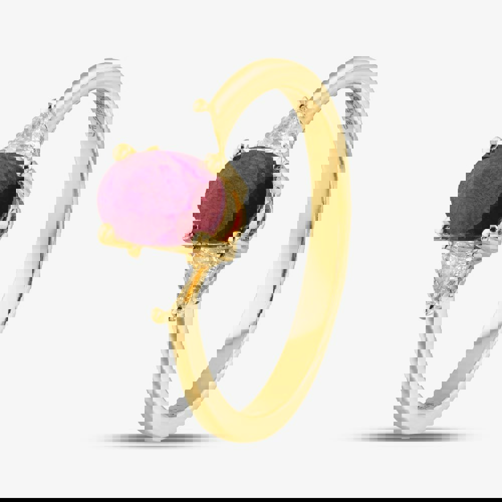 This elegant 18ct yellow gold ring features a striking oval-cut ruby at its centre, complemented by a trillion-cut diamond on either side. The design is finished with solitaire diamonds set on the shoulders, creating a sophisticated and timeless piece.