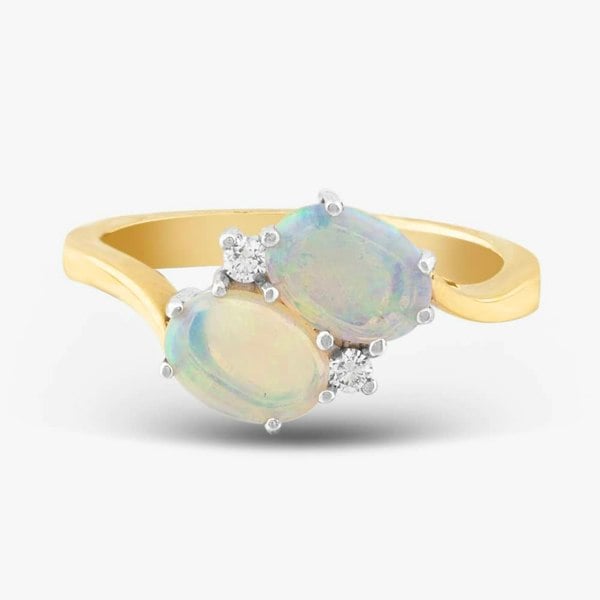 Exquisitely crafted from the finest 18ct yellow gold, this delicate twist ring is adorned with two oval-cut opal stones, enhanced with two dainty brilliant-cut white diamonds. This ring is sure to turn heads wherever you go. Whether you are looking for a ring to mark a special occasion or add a touch of luxury to your everyday life, this is the perfect ring.