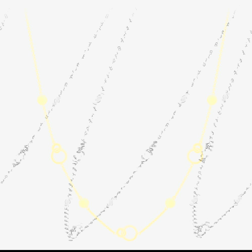 This 17-inch, 9ct yellow gold necklace features a harmonious blend of modern trace link chain and classic design elements. It showcases three refined interlocking circle stations and four polished round accents, creating a striking, bold effect. The necklace is secured with a lobster clasp.