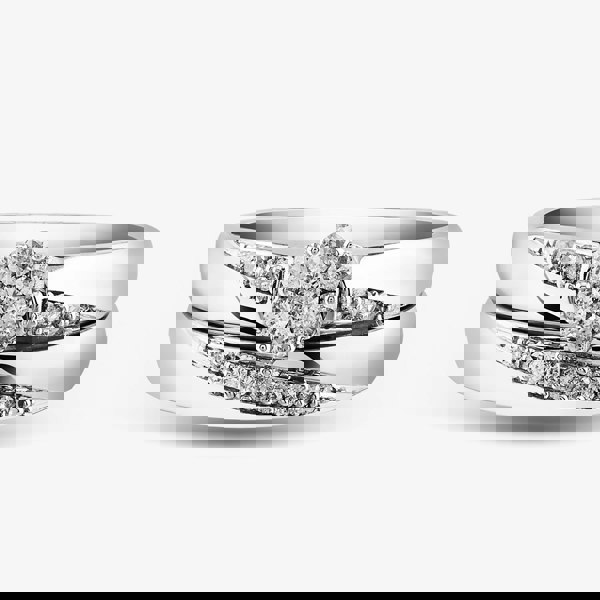 This stunning diamond cluster bridal set will carry sentimental memories of your special day. This elegant set features a 9ct white gold wedding band with a graduated diamonds design partnered with an eye-catching flower cluster engagement ring with matching graduated design. Worn together in perfect harmony this gorgeous set is a symbol of your everlasting love.