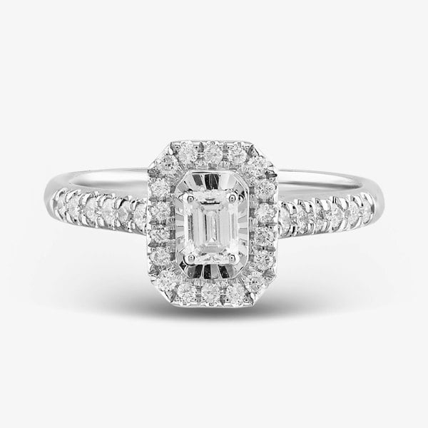 A stunning cluster ring which has been created in 9ct white gold and features a sparkling emerald cut diamond centre stone with diamond surround and set shoulders which altogether catch the light and glisten beautifully. With a total diamond carat weight of 0. 50ct this is the perfect choice for your loved one.