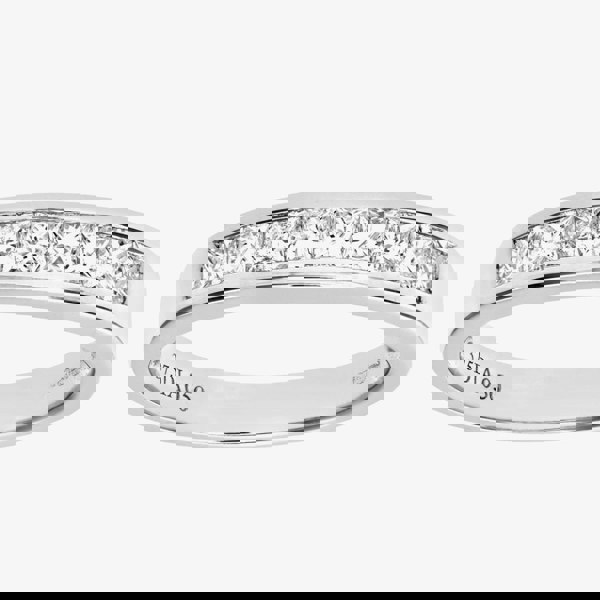 This modern half eternity style ring is crafted in 9ct white gold & features nine princess cut channel set diamonds with a total carat weight of 0. 50ct. This ring is an ideal half eternity or wedding band where the diamonds sparkle & catch the light beautifully.
