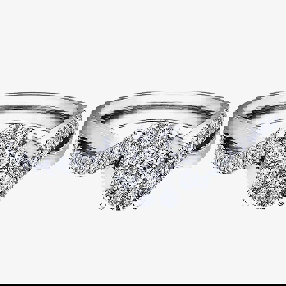 A 0. 14ct round brilliant centre stone is surrounded by a halo of eight smaller stones to create this cluster ring. Diamond diamonds on the twist shoulders then flow down onto the split shank to complete the piece.