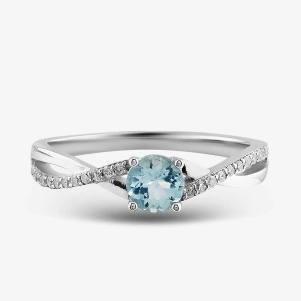 This exquisite crossover ring is delicately crafted from 9ct white gold and set with a dazzling brilliant-cut aquamarine stone. The aquamarine is accentuated by brilliant-cut white diamonds that form a crossover design on the shoulders of the ring. The diamonds are set in a four-claw setting that allows them to sparkle and catch the light. This ring is a stunning example of craftsmanship and beauty, and it would make a perfect gift for a loved one.