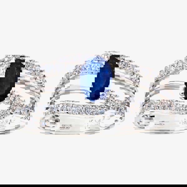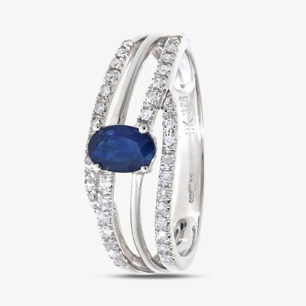 This modern three row ring is crafted in 9ct white gold & features a striking oval sapphire centre stone with an open sparkling diamond set three row design which has a total carat weight of 0. 20ct. This dress ring glistens & catches the light beautifully making the perfect addition to your collection.