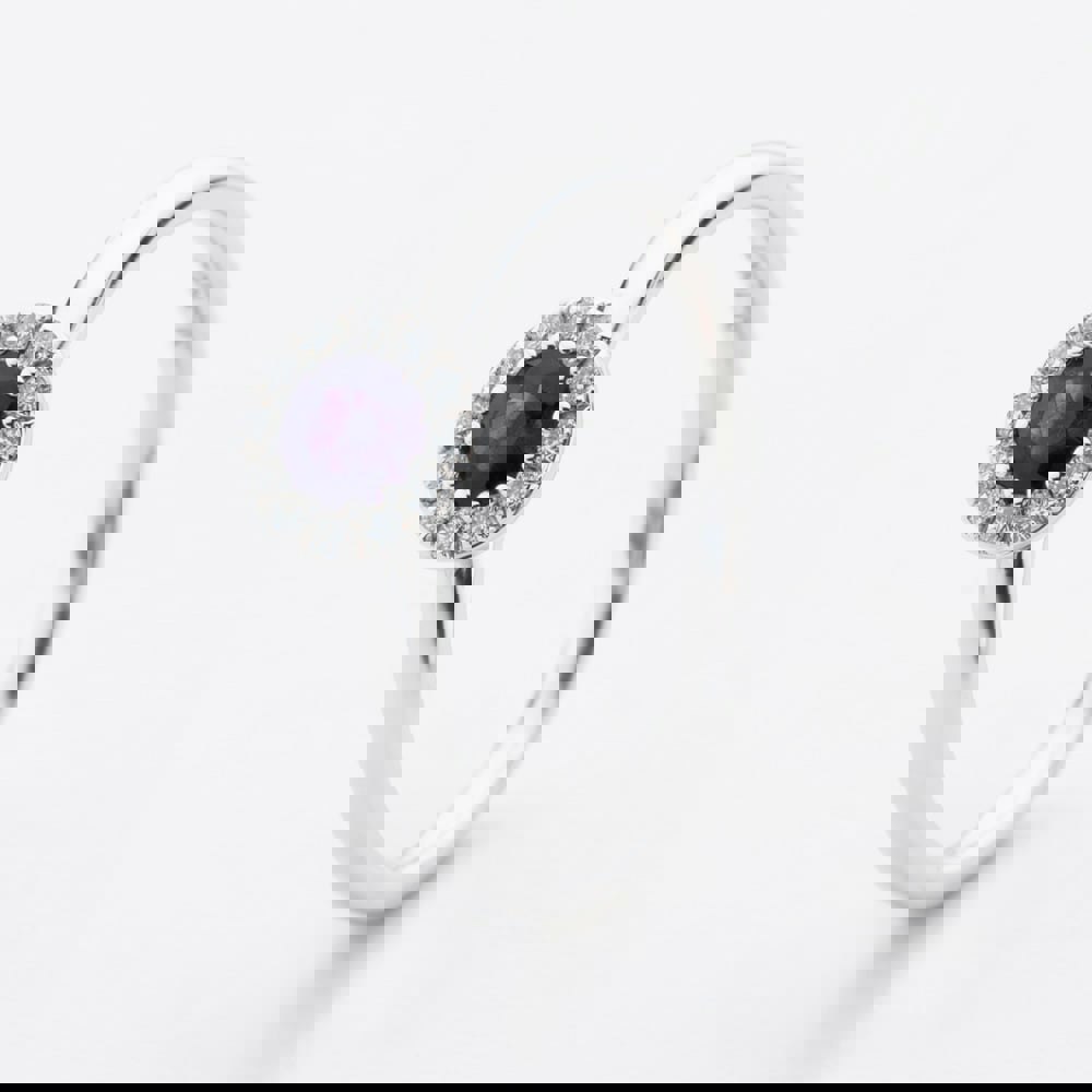 This elegant 9ct white gold ring features a brilliant-cut amethyst weighing 0. 28ct, surrounded by a sparkling cluster of 0. 10ct diamonds. The rich purple hue of the amethyst contrasts beautifully with the shimmering diamonds and sleek white gold setting, creating a timeless and sophisticated piece full of charm.
