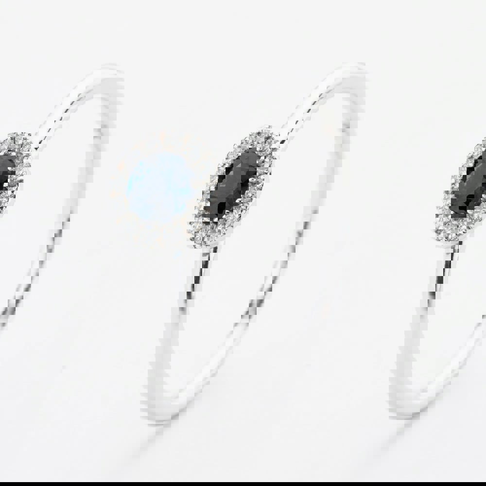 This stunning 9ct white gold ring showcases a brilliant-cut sapphire weighing 0. 31ct, encircled by a sparkling cluster of 0. 10ct diamonds. The deep blue sapphire contrasts beautifully with the bright white gold and shimmering diamonds, creating a classic and elegant piece that radiates timeless sophistication.
