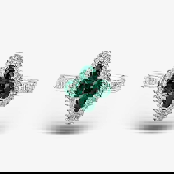 Exquisitely crafted from 9ct white gold, this quatrefoil-shaped ring is a sight to behold. This beautiful ring features a cluster of brilliant-cut emeralds surrounded by brilliant-cut white diamonds and accentuated further with diamond shoulders. This ring is sure to turn heads and make a statement.