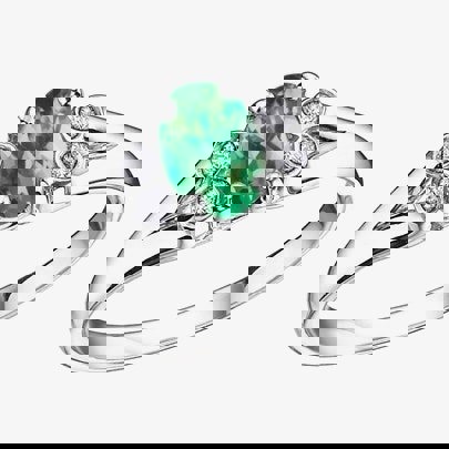 Vibrant colour, sparkle and shine are all qualities bestowed in this ring from our signature collection. As a gift for a loved one, or a treat for yourself, this ring will deliver elegance and satisfaction every time. The oval-cut emerald measures 6x4mm and the four diamonds are bezel-set into the ends of the split shouldered shank.