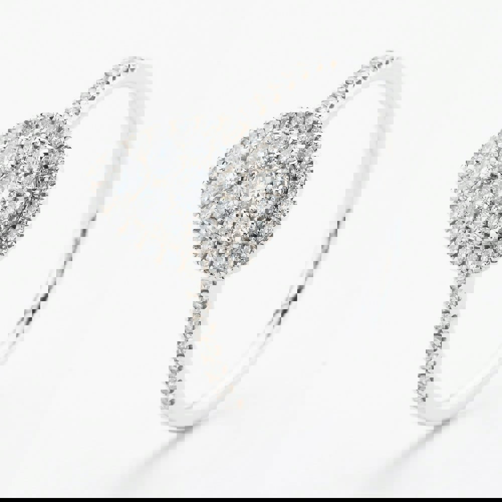 This elegant 9ct white gold ring features a pear-cut diamond at its centre, complemented by a sparkling cluster of diamonds set on the shoulders, with a total diamond weight of 0. 50ct. The combination of the pear-cut centrepiece and the glittering shoulder accents creates a timeless and sophisticated design that radiates brilliance and style.