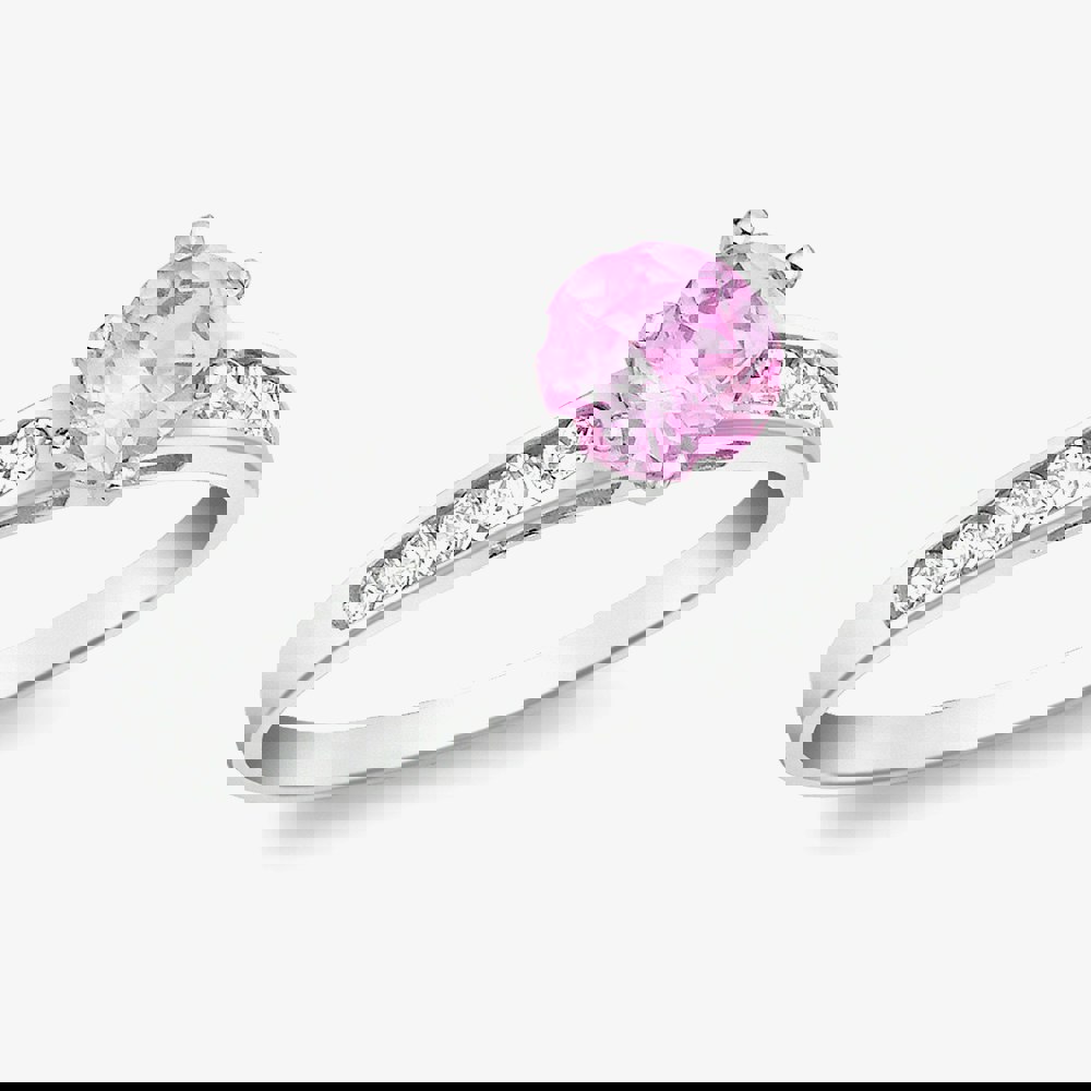 A ring set to suit a princess, the 9ct White Gold Pink and White Crystal-Set Solitaire Ring is a must-have for anyone who is fond of unique style and pops of colour. Made from 9ct white gold, this ring features a 5mm pink cubic zirconia stone surrounding by stone-set shoulders fitted with 10 x 2mm white cubic zirconia stones - giving anyone who wears this ring enough sparkle to last a lifetime and would make a beautiful engagement ring.