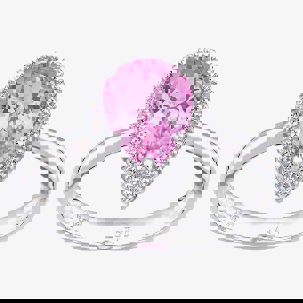 This delicate cluster ring is crafted from 9ct white gold and features a pear-cut pink sapphire centre stone. Accentuated further with a diamond halo with a total carat weight of 0. 07ct. This ring is a perfect stand-alone piece or ideal for layering and combining with other rings to create your unique look.