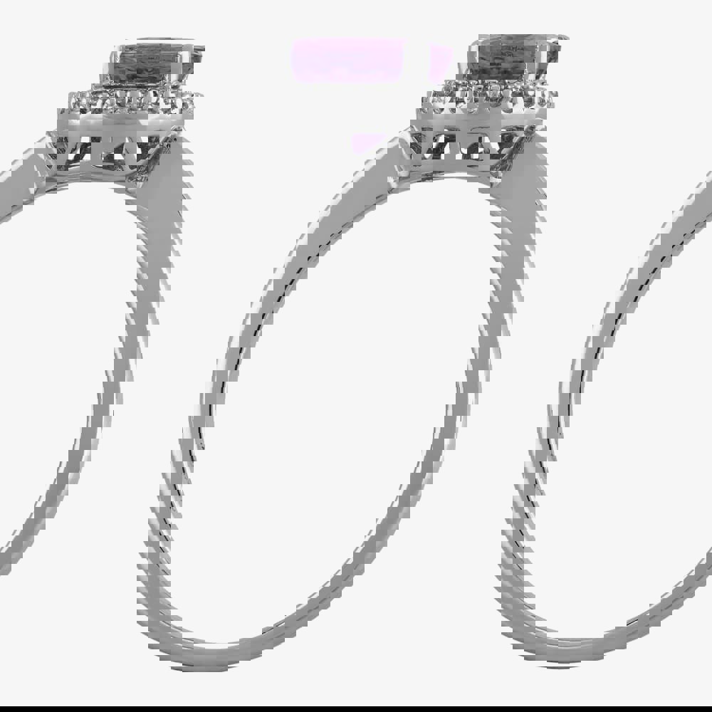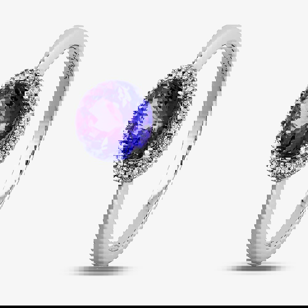 A round-cut tanzanite with a beaded halo of 22 round brilliant diamonds on an 9ct white gold shank.
