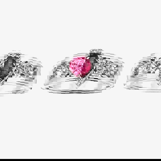 This pretty dress ring features a tension-set ruby in a beaded heart frame upon an openwork band with diamond-studded leaves and hearts.