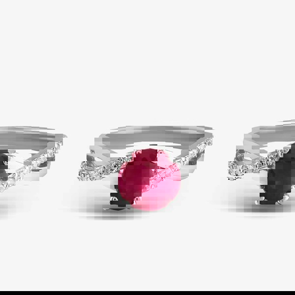 This exquisite crossover ring is delicately crafted from 9ct white gold and set with a dazzling brilliant-cut ruby. The ruby is accentuated by brilliant-cut white diamonds that form a crossover design on the shoulders of the ring. The diamonds are set in a four-claw setting that allows them to sparkle and catch the light. This ring is a stunning example of craftsmanship and beauty, and it would make a perfect gift for a loved one.