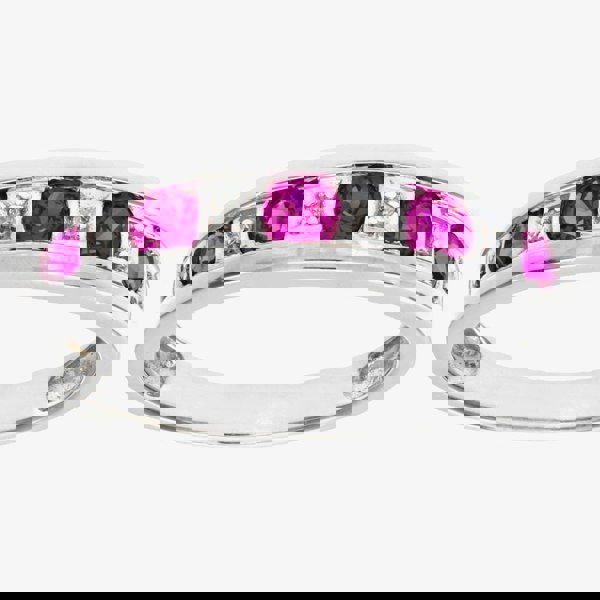 Exquisitely crafted from the finest 9ct white gold, this delicate half-eternity ring is adorned with an alternating pattern of brilliant cut rubies and 0. 02ct white diamonds. This ring symbolises eternal love and commitment and is sure to turn heads wherever you go. Whether you are looking for a ring to mark a special occasion or add a touch of luxury to your everyday life.