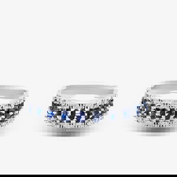 Exquisitely crafted from 9ct white gold, this half-eternity is a sight to behold. This beautiful ring is adorned with a row of brilliant-cut sapphires, accentuated further with brilliant-cut white diamonds set either side, in a classic central four claw setting. A perfect ring for any occasion.