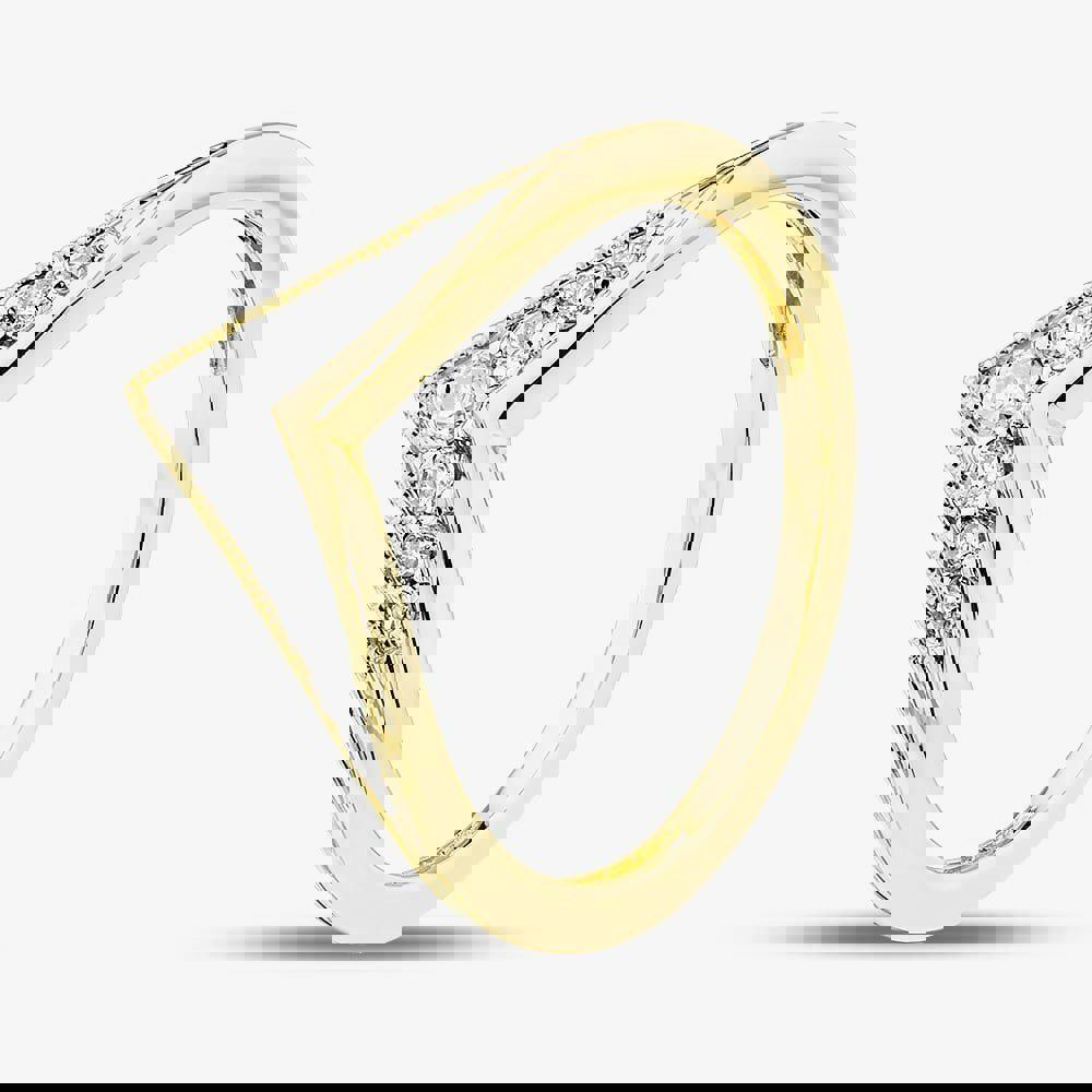 Crafted in 9ct Yellow Gold, this elegant wishbone ring features a total of 0. 15ct brilliant cut diamonds, beautifully set along a distinctive ribbed pattern. A graceful design that combines classic sparkle with unique texture.