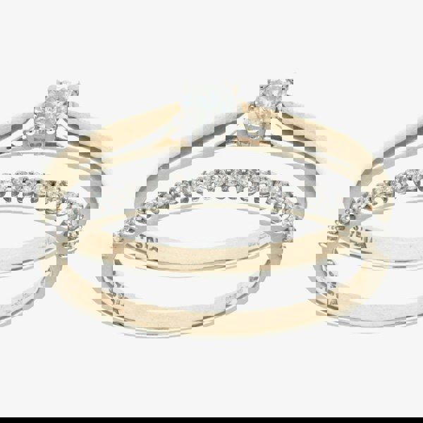 This attractive bridal ring set is crafted in 9ct yellow gold & features brilliant cut four claw diamond solitaire ring & a matching claw set diamond set band ring which have a total carat weight of 0. 25ct.