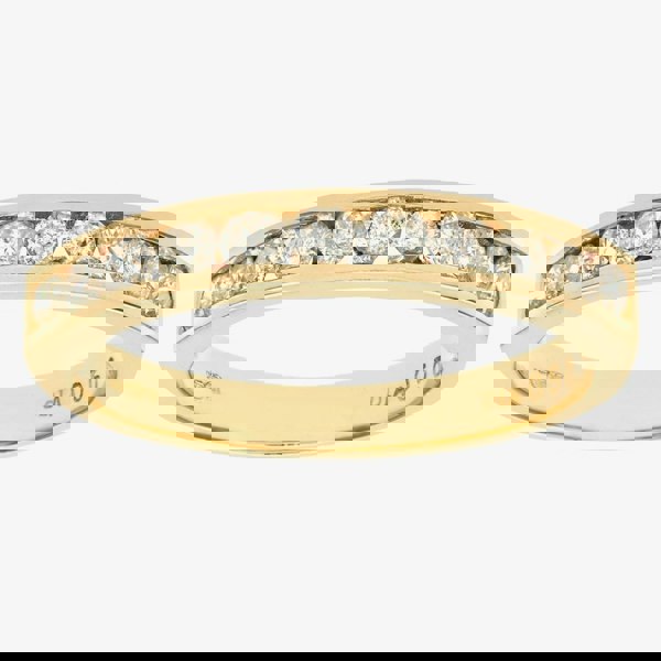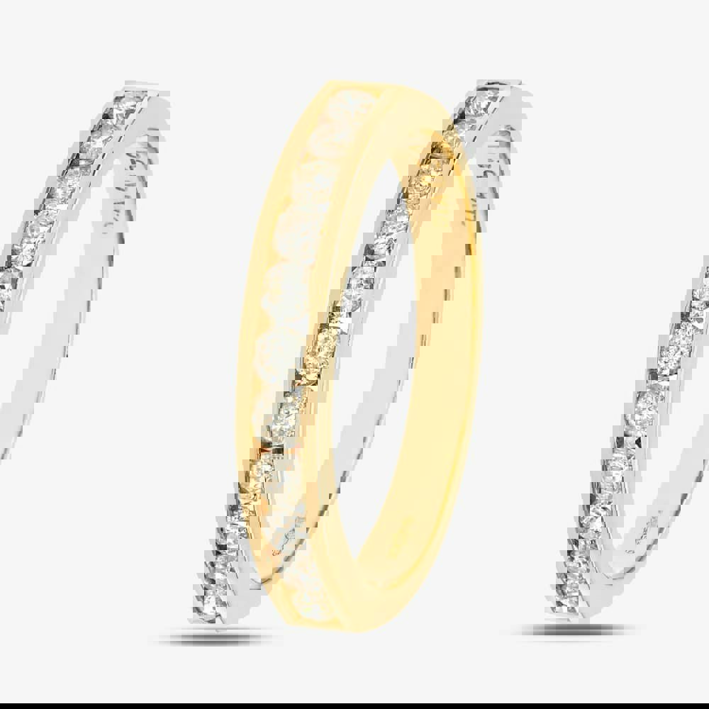 This traditional half eternity ring is crafted in 9ct yellow gold & features a channel set design with sparkling round brilliant diamonds which have a total carat weight of 0. 50ct. This ring is a perfect stand-alone piece or ideal for layering & combining with other rings to create your own unique look.