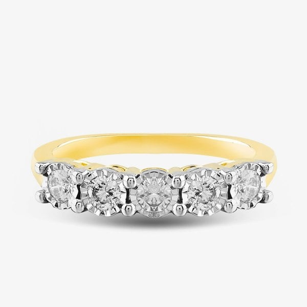 This eye-catching ring has been created in 9ct yellow gold and features five sparkling round cut diamonds that has a total carat weight of 0. 50ct are set in a white gold illusion setting with a claw set design. This traditional and versatile design makes this ideal for a wedding band, half eternity style or a dress ring to add a touch of sparkle to any outfit.