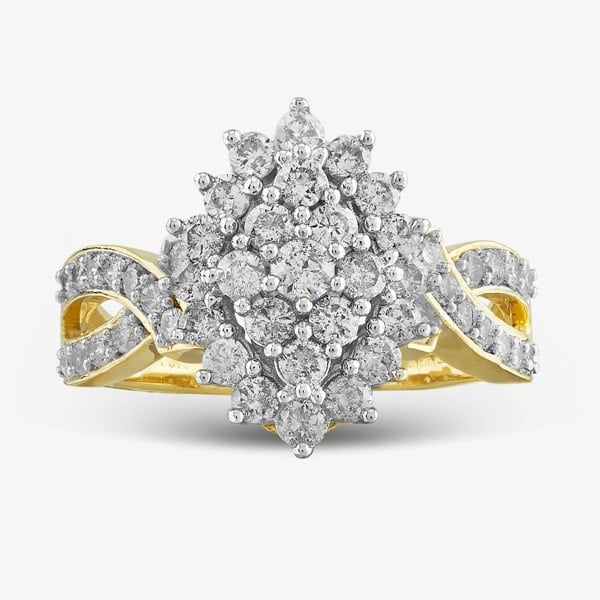 This eye-catching cluster ring has been created in 9ct yellow gold and features a tiered cluster design with open crossover shoulders all set with beautiful sparkling claw set diamonds that has a total carat weight of 1. 00ct. This traditional design is the perfect statement piece to add a touch of sparkle to any outfit.