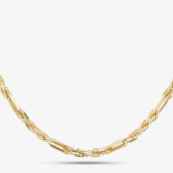Elevate your style with this 9ct Yellow Gold 18 Inch Figaro Rope Chain, a timeless blend of luxury and craftsmanship. Made from premium 9ct gold, it features the classic Figaro design with alternating short and long links with a rope chain twist, polished to a brilliant shine. The 18-inch length sits elegantly on the neckline, perfect for both everyday wear and formal occasions. Secured with a sturdy lobster clasp, this versatile chain looks stunning worn alone or paired with other gold jewellery.