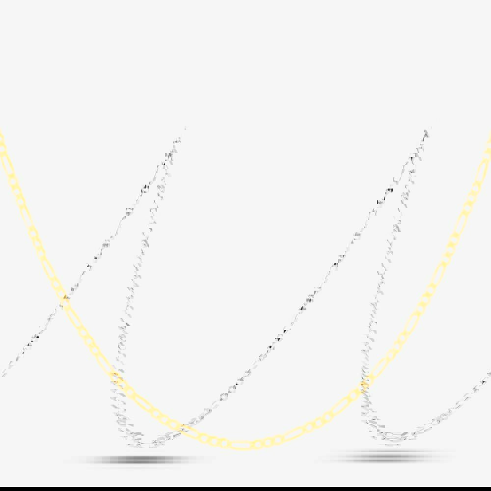This elegant 9ct yellow gold figaro chain necklace features a distinctive pattern of alternating short and long links, creating a stylish and sophisticated design.