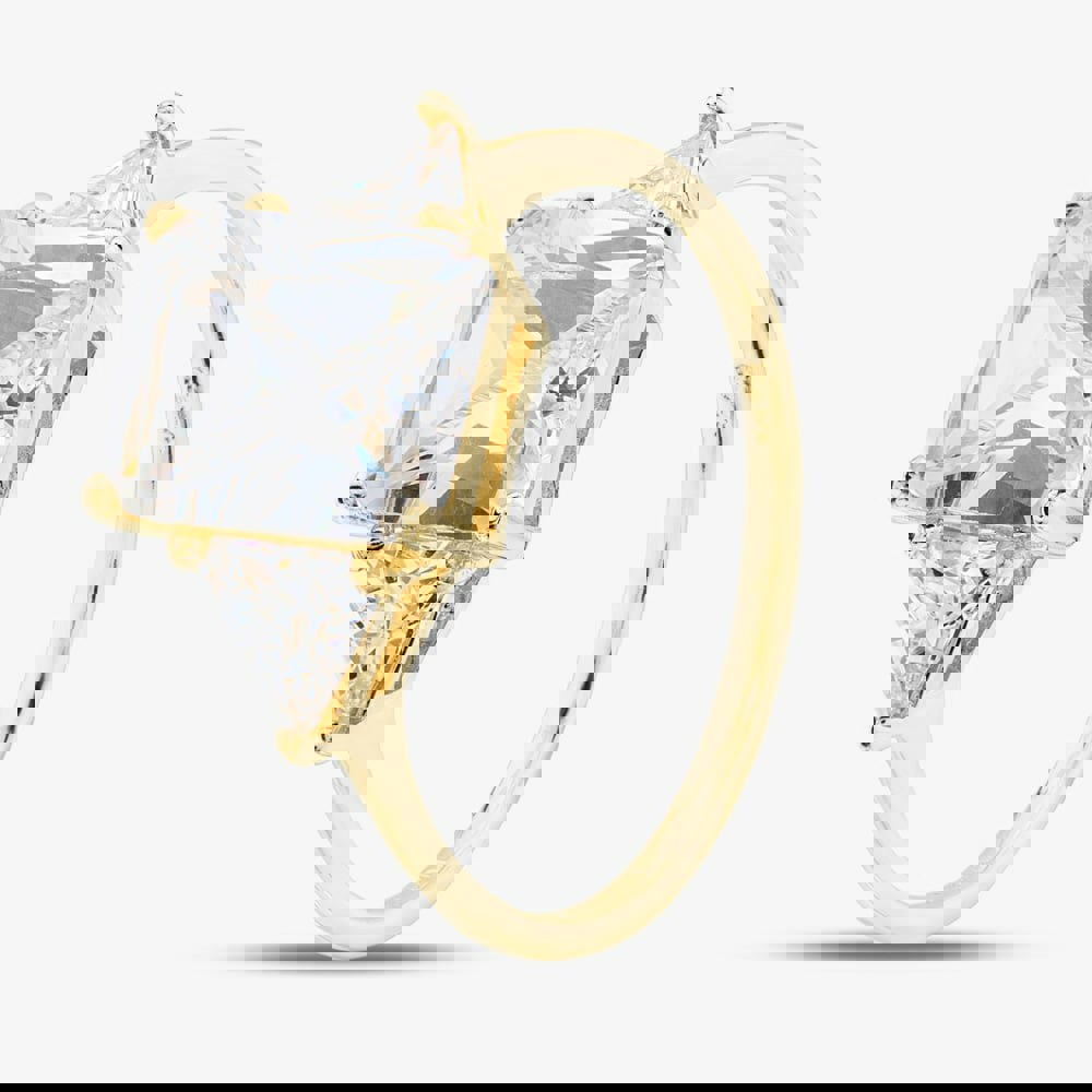 A ring set to suit a princess, the 9ct Yellow Gold 3-Stone Crystal Ring 1. 84. 5109 is a must-have for anyone who is fond of unique style and sparkle. Made from polished 9ct yellow gold, this three stone ring has a 1mm ring shank and features an 8mm x 10mm rectangular cubic zirconia centre stone adorned by 6mm x 6mm triangular cubic zirconia crystals in a claw setting - giving anyone who wears this ring enough sparkle to last a lifetime.