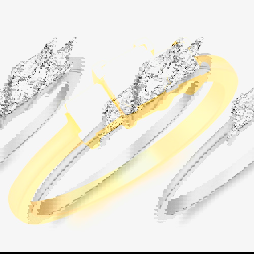 A ring set to suit a princess, the 9ct Yellow Gold 3-Stone Graduated Crystal Ring 1. 84. 6461 is a must-have for anyone who is fond of unique style and sparkle. Made from polished 9ct yellow gold, this three stone ring has a 2mm ring shank and features a 5mm x 5mm princess-cut cubic zirconia centre stone adorned by two 3mm x 3mm princess-cut cubic zirconia crystals in a claw setting - giving anyone who wears this ring enough sparkle to last a lifetime.