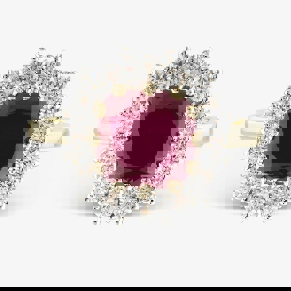 Make a bold and elegant statement with this 9ct Yellow Gold Ruby and Diamond Ring, featuring an impressive 3. 95ct round-cut ruby in a 12-claw setting, surrounded by a halo of brilliant-cut lab-grown diamonds totalling 1. 00ct. Expertly crafted to maximise sparkle, this striking ring exudes refined sophistication and timeless luxury, a truly show-stopping piece.