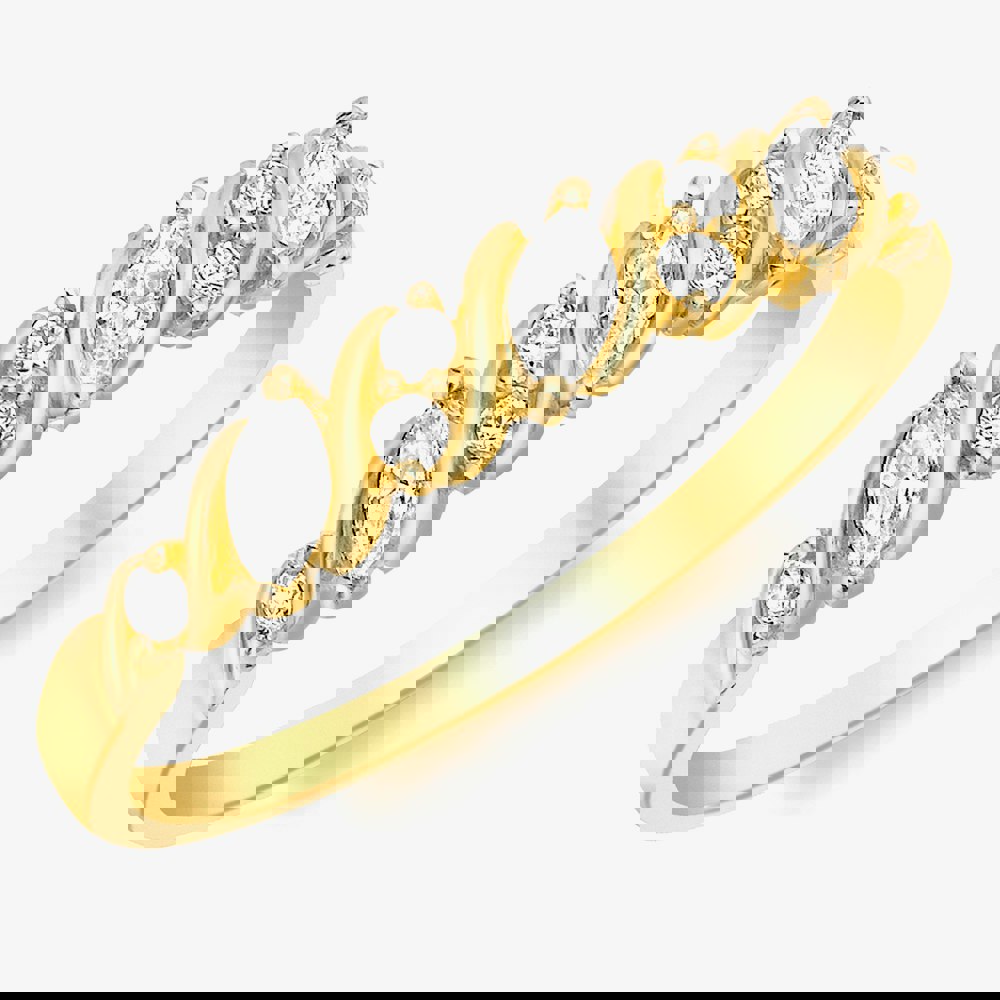 The 9ct Yellow Gold 9-Stone Crystal Swirl Ring 1. 84. 6551 is a must-have for anyone who is looking for unique style and lots of sparkle. Made from polished 9ct yellow gold, this nine stone ring has a delicate 1mm ring shank and features three 2mm x 5mm marquise-cut cubic zirconia crystals and six 1mm round cubic zirconia crystals in a claw setting - giving anyone who wears this ring enough sparkle to last a lifetime.