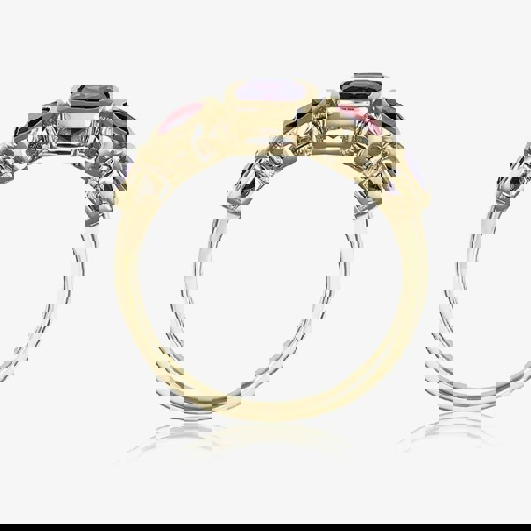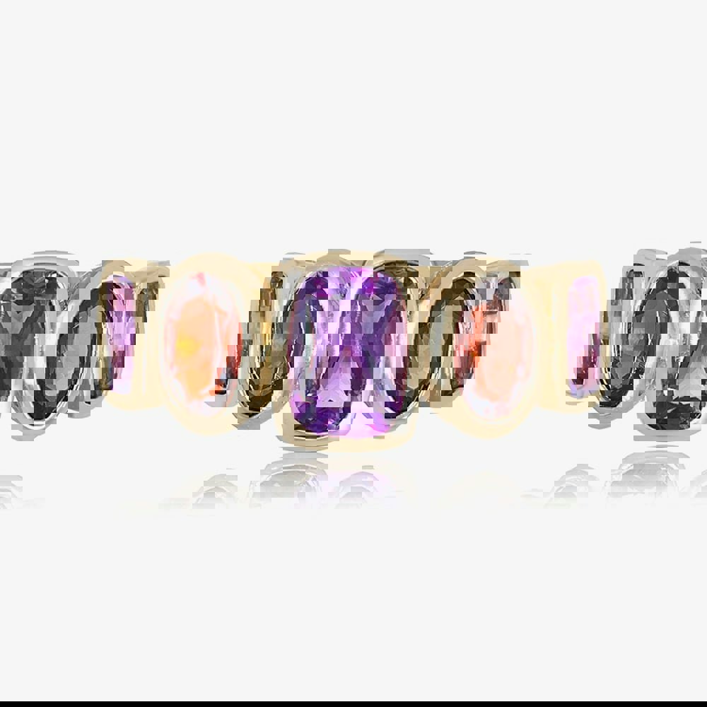 Crafted in radiant 9ct yellow gold, this statement ring features rich amethyst and garnet gemstones, both enhanced through heat treatment to deepen their natural colour. The sleek rubover settings offer a modern edge while securely showcasing the vivid hues of each stone. Bold yet refined, it’s a timeless piece designed to stand out.