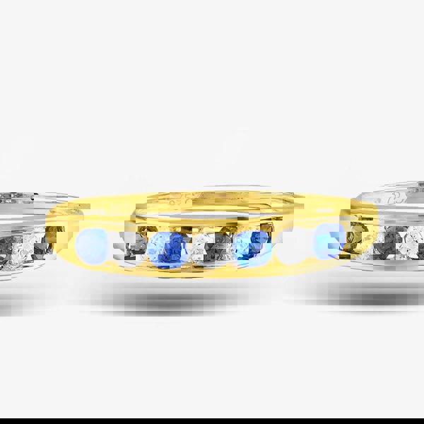 This beautiful blue & clear cubic zirconia half eternity ring is created in 9ct yellow gold. This half eternity ring features sparkling alternating blue & clear cubic zirconia stones in a tension setting. The ideal half eternity or dress ring for that special someone.