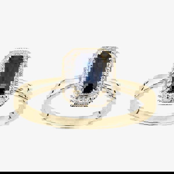 This attractive cluster ring is crafted in 9ct yellow gold & features an emerald cut Sapphire centre stone with a sparkling 0. 08ct diamond surround & intricate mill grain edge. This ring is a perfect stand-alone piece or ideal for layering & combining with other rings to create your own unique look.