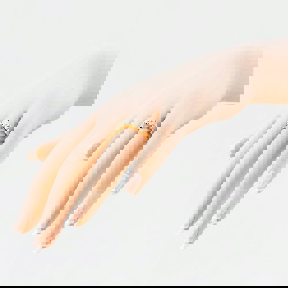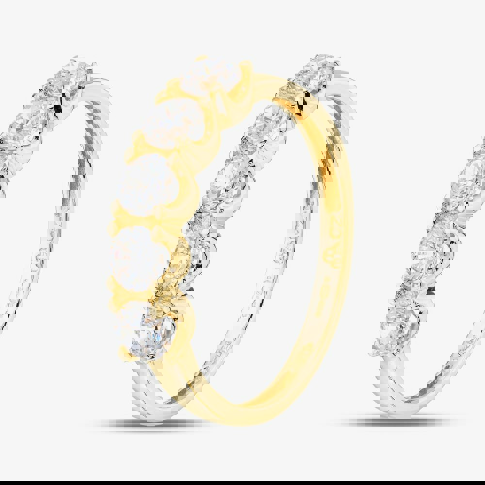 This 9ct Yellow Gold Five Stone Half Eternity Ring features five dazzling cubic zirconia stones set in a classic gold band. Elegant and timeless, it adds a touch of sparkle to any occasion.
