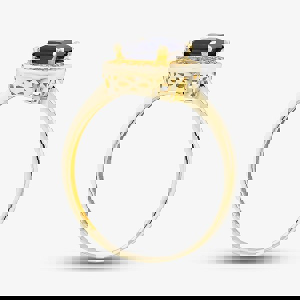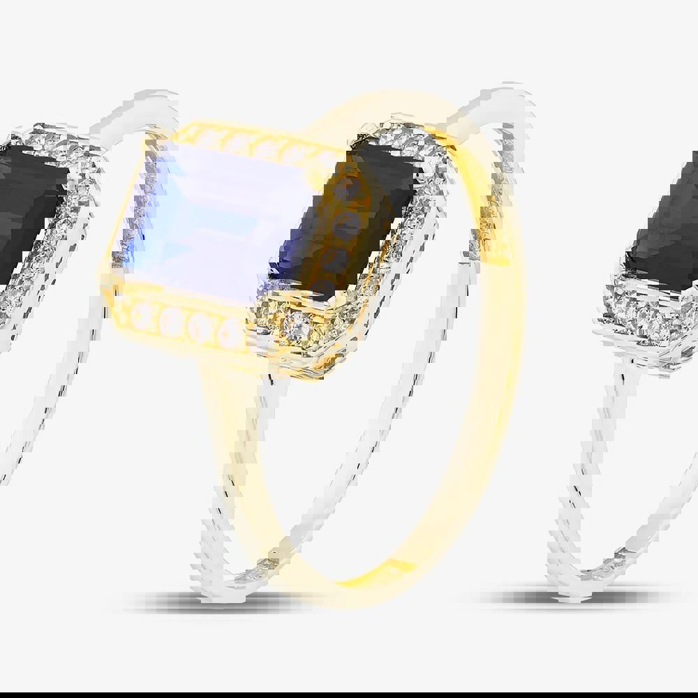 This sophisticated 9ct gold ring showcases a vibrant blue emerald-cut cubic zirconia at its centre, encircled by a halo of white brilliant-cut stones in a classic cluster design. The detailed cut-out setting beneath the stone lets light pass through, amplifying its sparkle. A striking and elegant piece, ideal for any occasion or as a thoughtful gift.