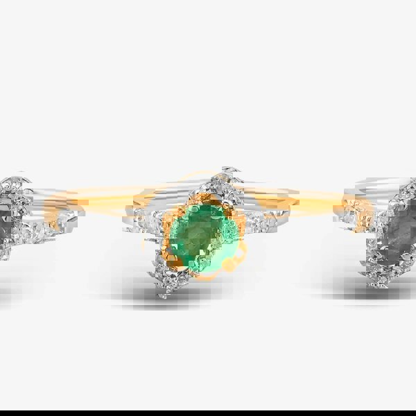This exquisite halo ring is a masterpiece of craftsmanship. The delicate 9ct yellow gold band is set with a brilliant-cut emerald centre stone, which is surrounded by a halo of brilliant-cut white diamonds. The diamond-set shoulders add a touch of elegance, making this ring a truly stunning piece of jewellery.