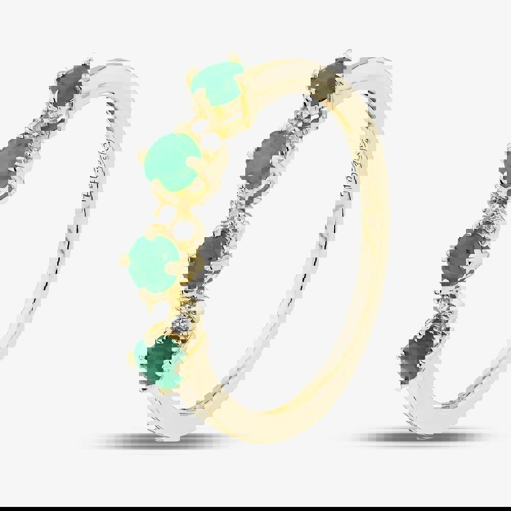 This elegant half eternity ring is beautifully crafted in 9ct yellow gold and features a striking arrangement of four vivid green emeralds, each separated by smaller sparkling white diamonds. The alternating pattern highlights the rich colour of the emeralds while the diamonds add a subtle brilliance, creating a look that is both timeless and refined. Perfect for marking a meaningful moment or adding a touch of luxury to everyday wear.