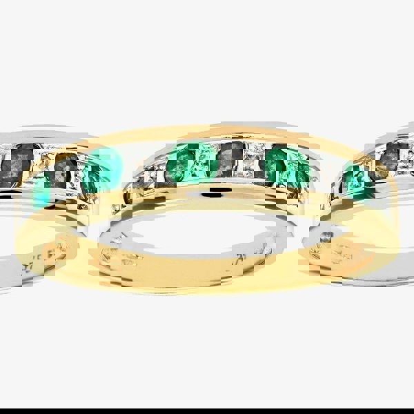 This attractive half eternity ring is crafted in 9ct yellow gold & features five green emerald stones with six illusion set sparkling diamonds which have a total carat weight of 0. 02ct. This ring is a perfect stand-alone piece or ideal for layering & combining with other rings to create your own unique look.