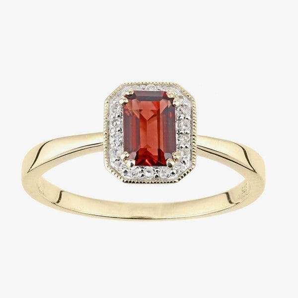 This modern cluster ring is crafted in 9ct yellow gold & features an emerald cut garnet centre stone with a sparkling diamond surround which has a total carat weight of 0. 08ct & a mill grain edge design. This ring is a perfect stand-alone piece or ideal for layering & combining with other rings to create your own unique look.