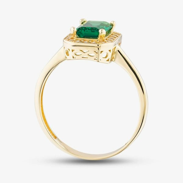 This stunning 9ct Yellow Gold Ring features a striking emerald-cut green cubic zirconia stone at its centre, framed by a glittering halo of clear cubic zirconia stones. The bold, regal design is both timeless and eye-catching, perfect for adding a touch of sophistication to any look.