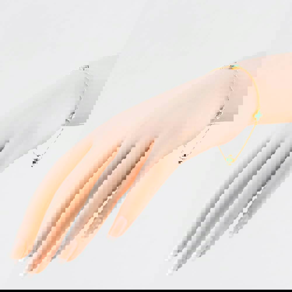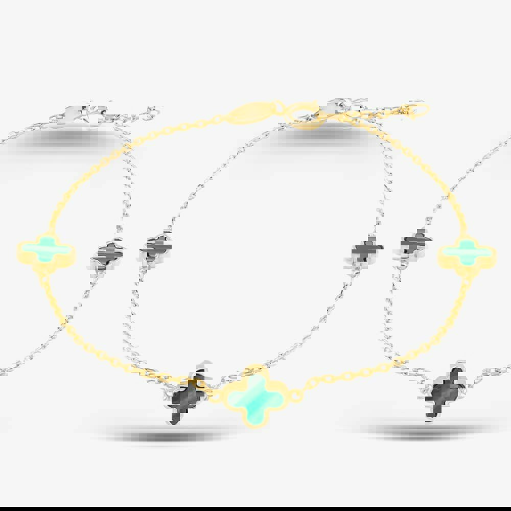 Warm, polished and easy to wear, the T.H.Baker Malachite Petal Bracelet brings a refined pop of colour to the wrist. Crafted in 9ct yellow gold, it pairs a delicate chain with a malachite detail in a petal shape, introducing a rich green accent against the gold tone.